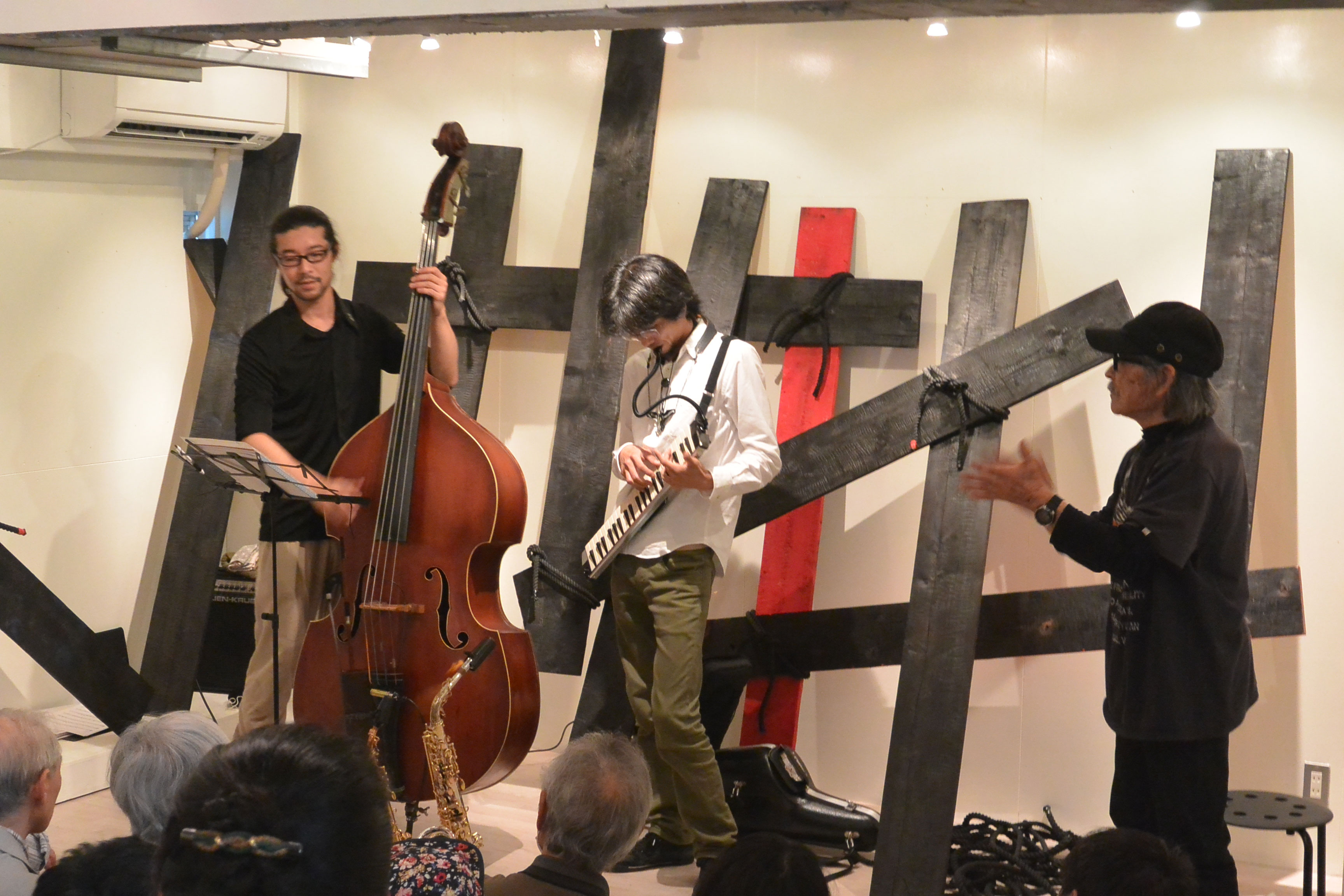 そうそう、妙子さんは4年前の竜太郎さんの独、ブッパタールのORT公演の時にインスタレーションをしてくれています。長年のお付き合いではいろいろと関係が自然と増えていくものです。例えば、盲目のダンサー橋本真奈さんとジャンさんのコラボも静岡で実現出来ました。バール・フィリップスとの「二頭のライオン物語」(ライオンヘッドのコントラバス2台を交換するプロジェクトツア−)でも井上さんと共に御世話になりました。この1月には、オリヴィエのタンゴをフィーチャーしたものをやっていただきました。東壽院というお寺でした。病気が癒えた、さとうじゅんこさんも急遽参加して、とても暖かい、すばらしい会になりました。住職とも良い出会いができました。
